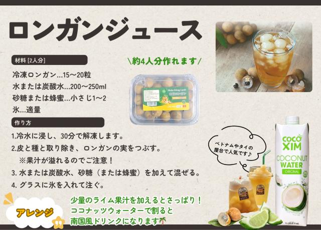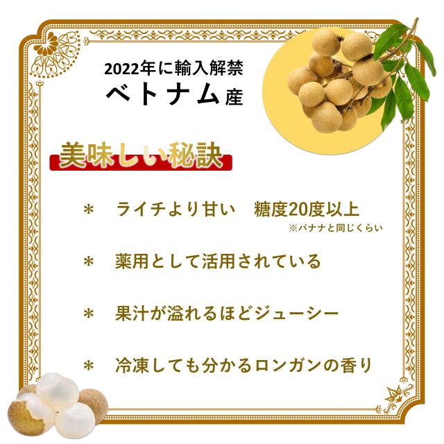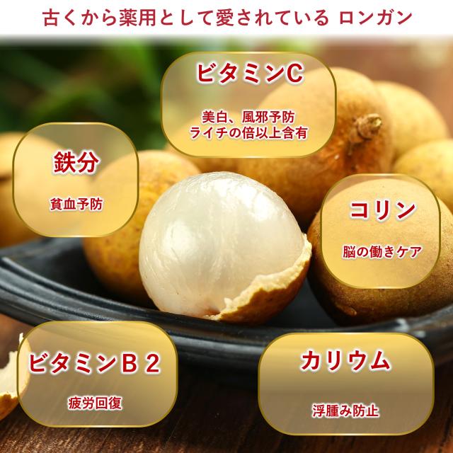 内容量:400g 入数:24 ケース重量:9.6kg 特徴:ライチの仲間で薬効を持つ別名「竜目」甘みが強く果汁たっぷりとすっきりとした後味 栄養:ビタミンC、カリウム、鉄分、マグネシウム Brix(糖度) :22% ※当社計測
