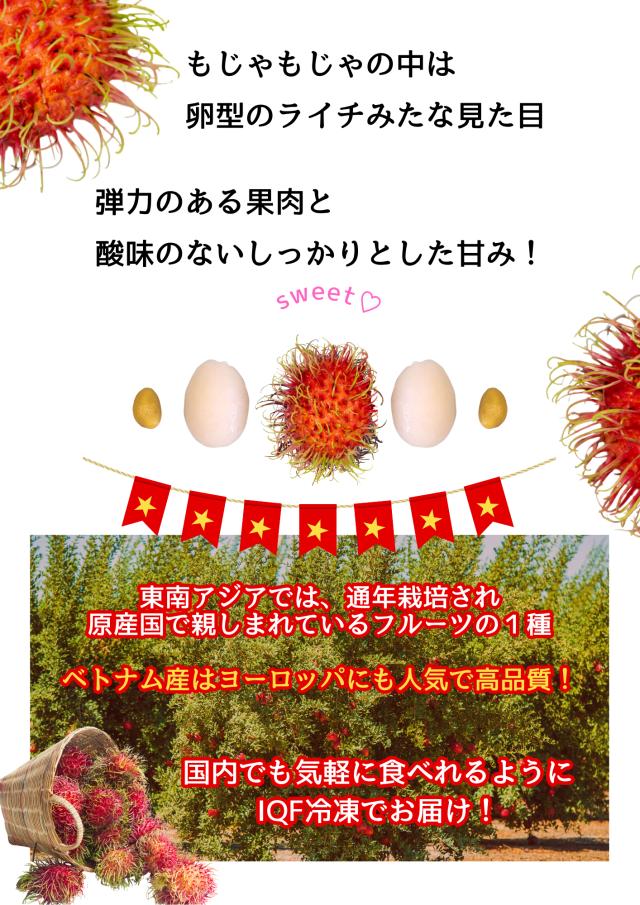 内容量:500g 入数:24 ケース重量:10kg 特徴:甘みがライチより強く果肉がしっかりして弾力がある。 栄養:ビタミン、カリウム、鉄分、ポリフェノール Brix(糖度) :25% ※農園測定